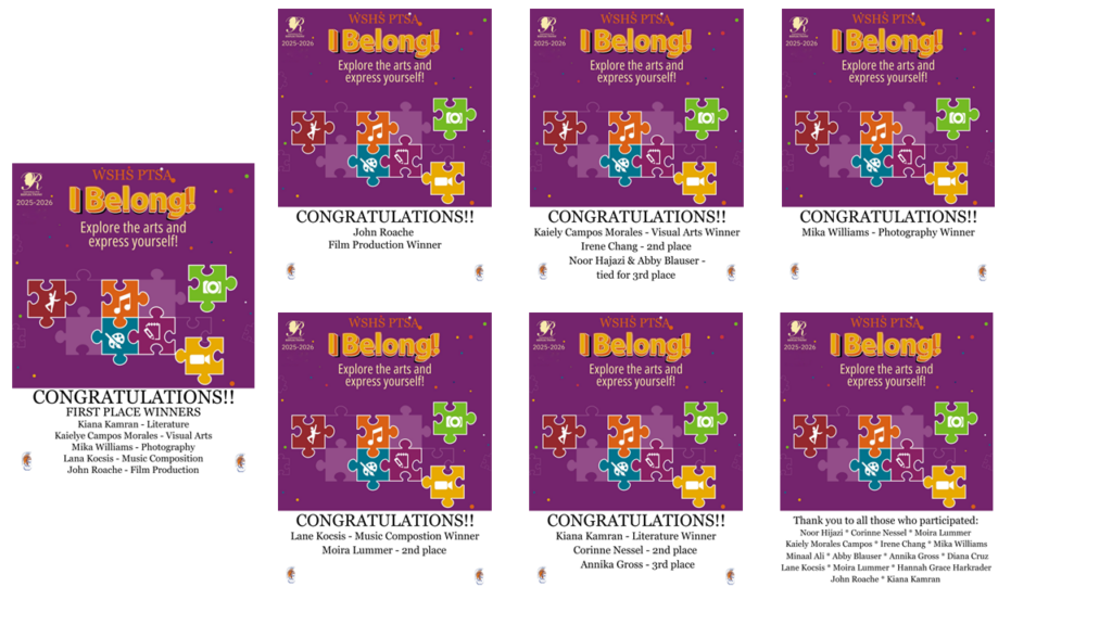WSHS PTSA is participating in the National PTSA’s Reflections Art Program. WSHS students are invited to submit arts creations in various categories: Dance choreography, Film production, Literature, Music composition, Photography, Visual Arts. See the Reflections page for full details.
