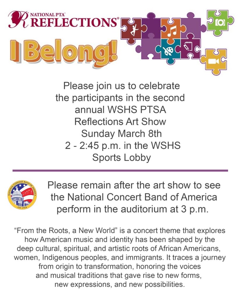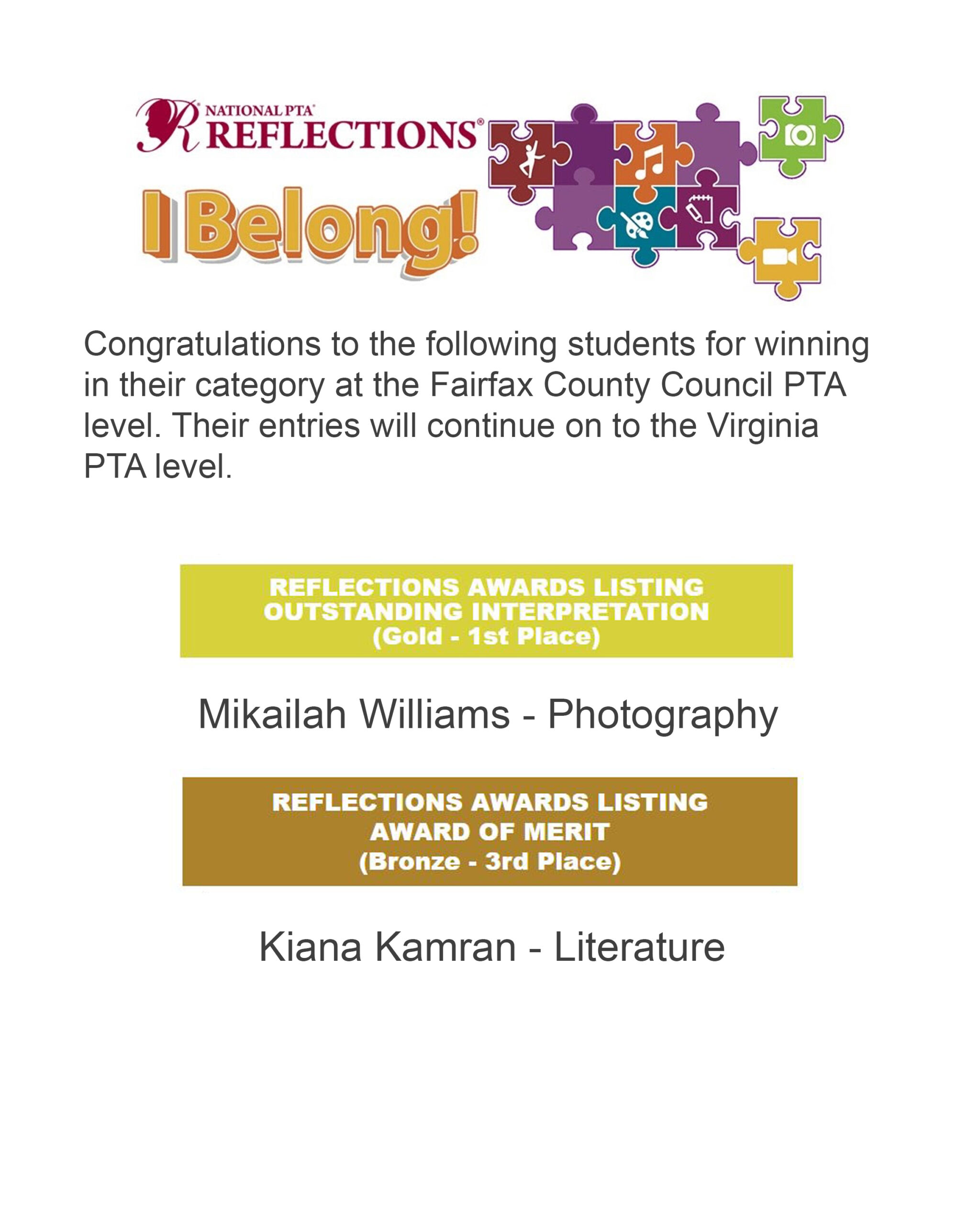 Congratulations to Mikailah Williams and Kiana Kamran for winning in their Reflections categories at the Fairfax County Council PTA level. Join us in celebrating them and all the participants at the second annual WSHS PTSA Reflections Art Show on March 8th at 2:00.