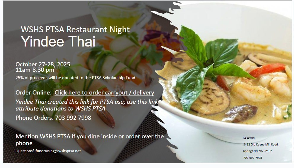 Mention WSHS PTSA if you dine in or order by phone. Questions? Contact fundraising@wshsptsa.net